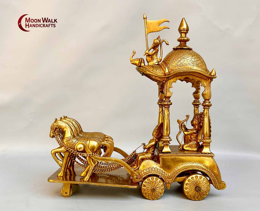 Majestätische Mahabharata-Wagen-Skulptur aus massivem Messing: Krishna, Arjun und Hanuman mit goldenen Pferden – eine göttliche Darstellung der indischen Mythologie, die Sieg, Wohlstand und spirituelles Wachstum verkörpert