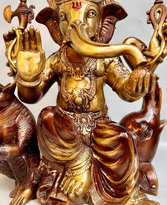 Ganpati-Statue aus goldenem Messing – Mushak und Elefantenrüssel. Code ARP131, Indien, Moonwalk Handicrafts