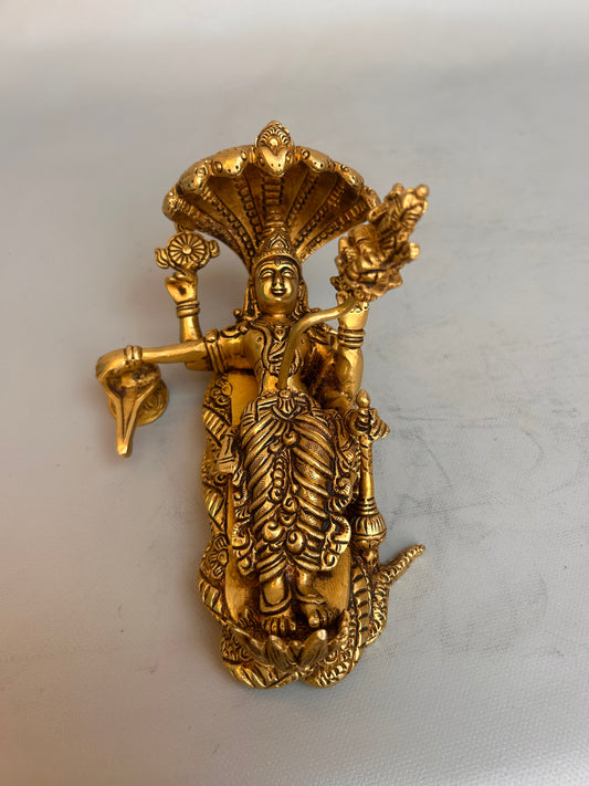 Messingstatue des auf einer Schlange sitzenden Gottes Vishnu, hinduistischer Gott der Bewahrung, Code: ARP114