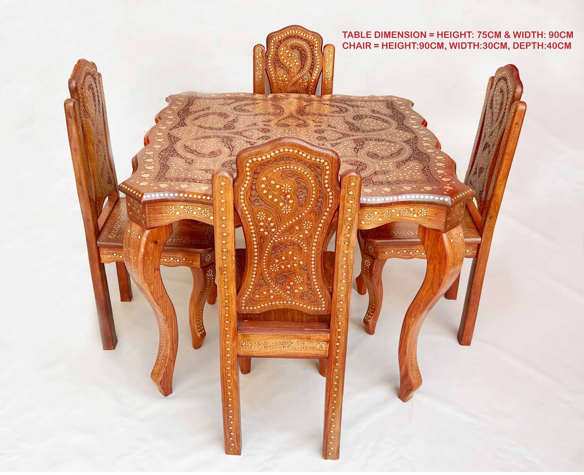 Handgefertigtes Esstisch-Set mit Messingschnitzerei, 1 Tisch und 4 Stühle, Made in India, Möbel von Moonwalk Handicrafts, Palisanderholz, Sheesham