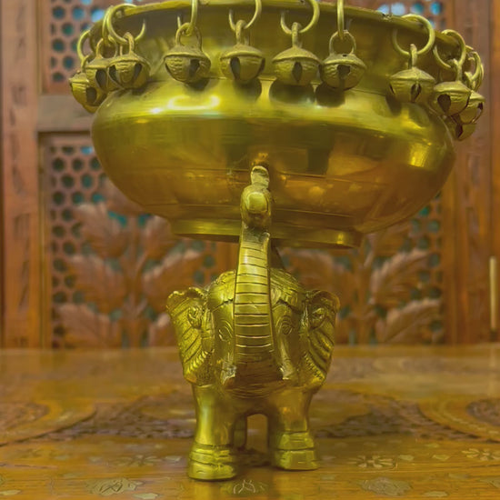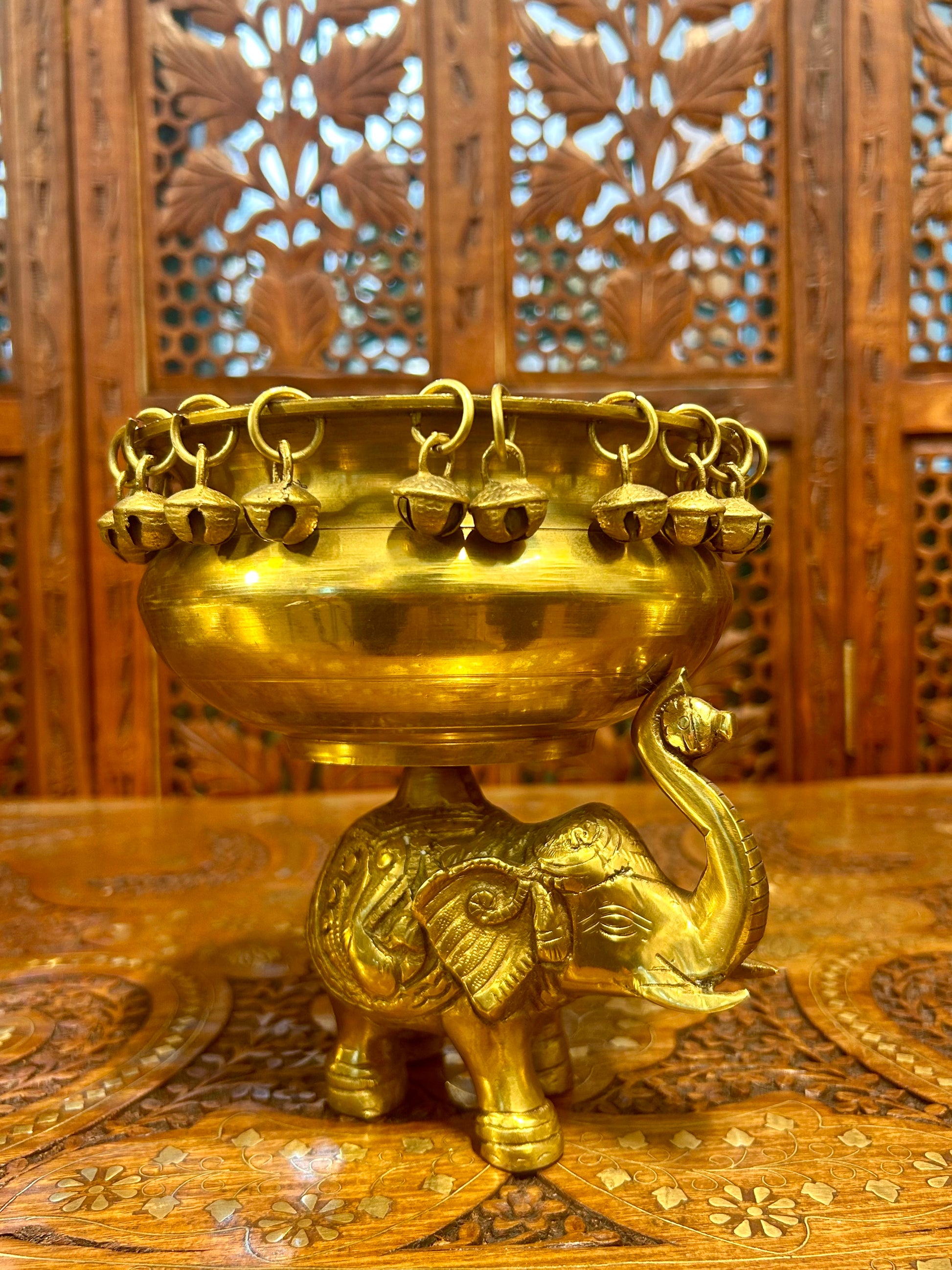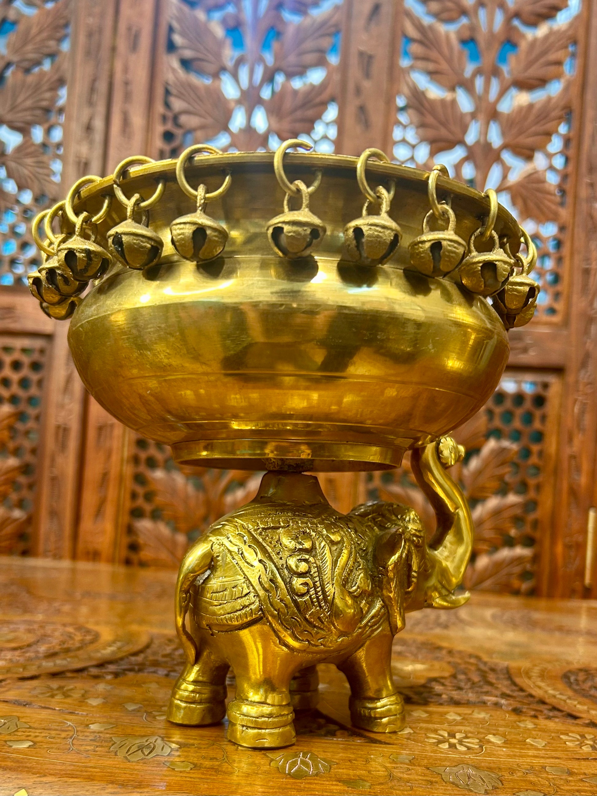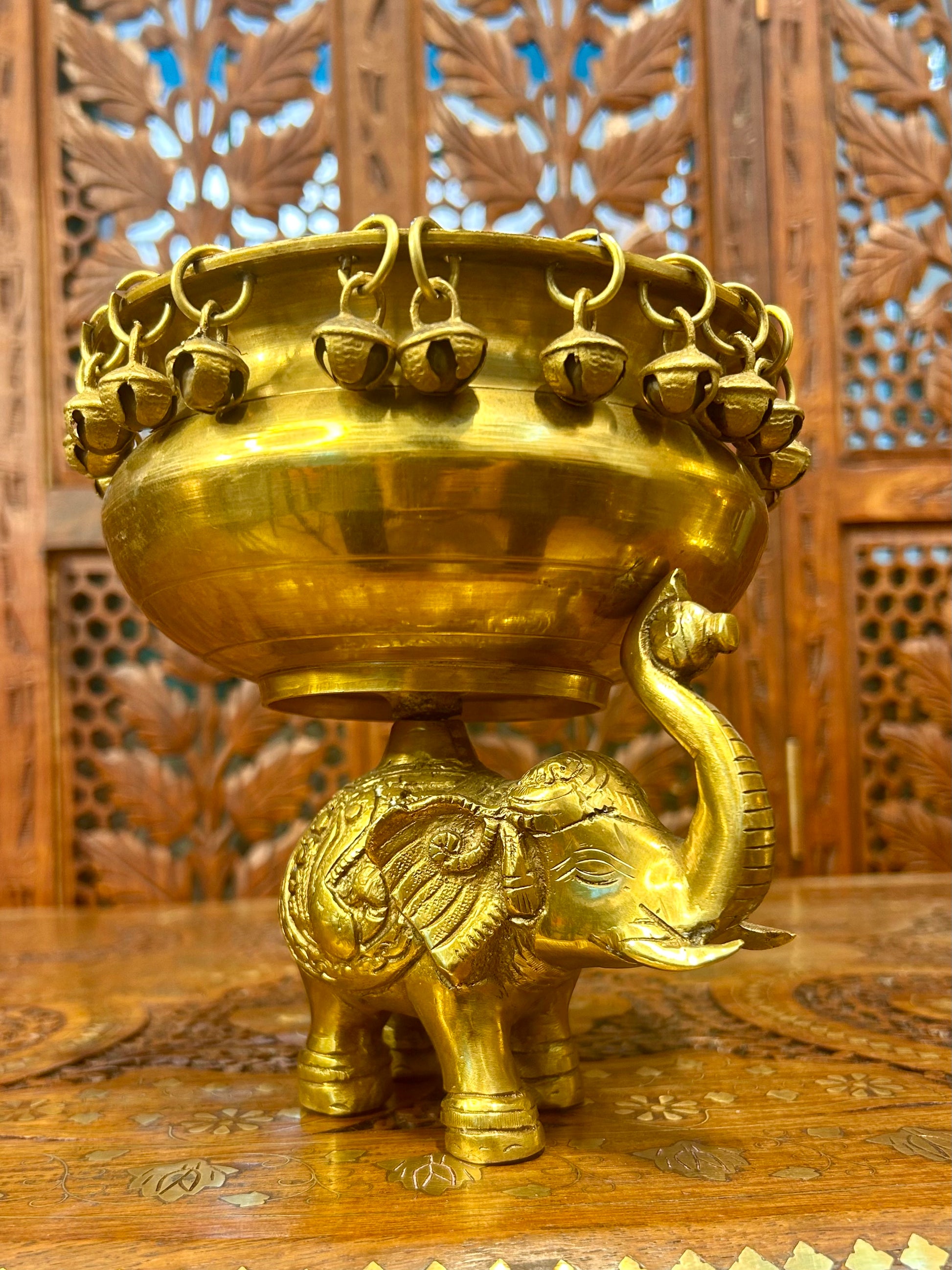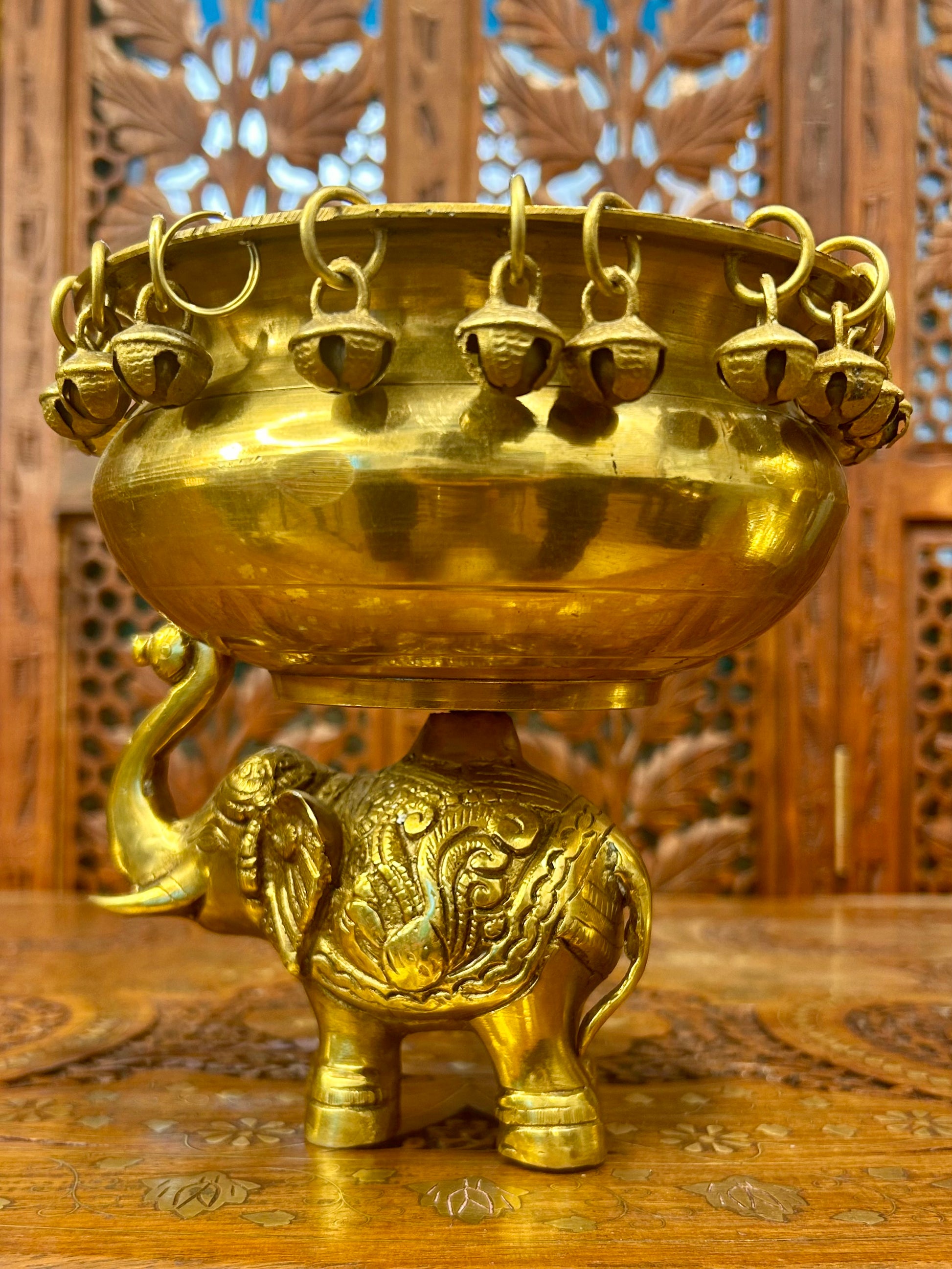 Antique Brass Urli with Elephant Stand & Bells, Handmade Indian Decor, Luxury Pooja Bowl, Festive Centerpiece, Housewarming Gift, Mandir Decor