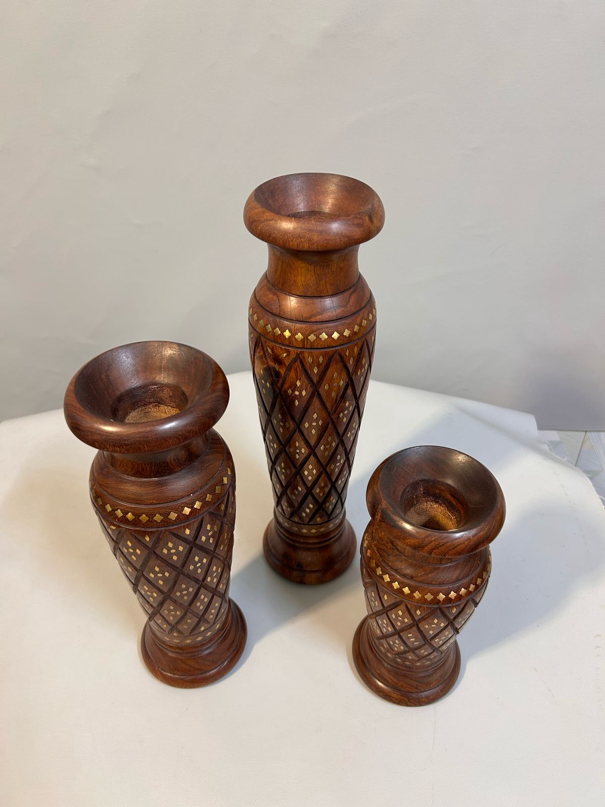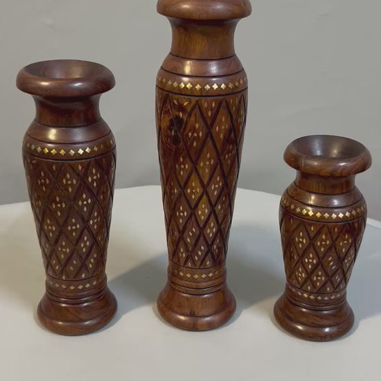 Handcrafted Wooden Vase Set with Brass Inlay, Decorative Carved Flower Vase, Indian Wood Art, Traditional Home Décor, Rustic Boho Table Vase